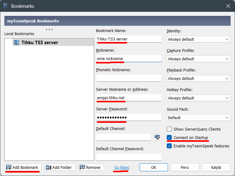 - “Connect on startup” valinta löytyy, kun alhaalta valitsee ensin “Go Advanced”